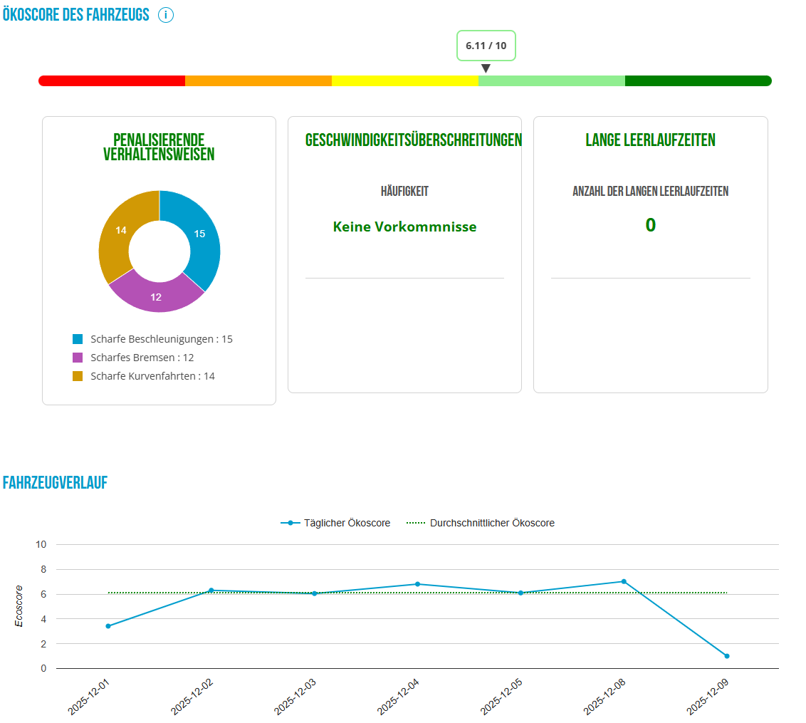 Unser Eco-Driving-Bericht identifiziert riskante Verhaltensweisen von Fahrern: abruptes Beschleunigen und Bremsen, enge Kurvenfahrten, Geschwindigkeitsüberschreitungen oder längere Leerlaufzeiten. Diese Informationen helfen, Fahrgewohnheiten zu verstehen und zu verbessern.