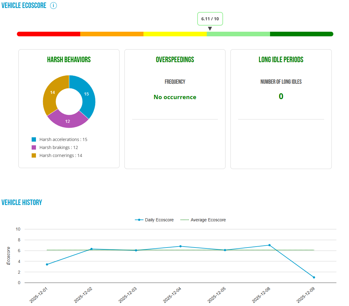 Our eco-driving report identifies risky driver behaviours: sudden acceleration and braking, sharp turns, speeding, or prolonged idling. This information helps you understand driving habits and improve them.